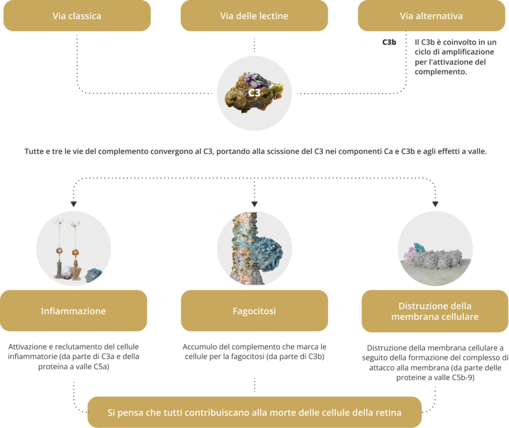 L’iperattivazione del sistema del complemento è stata implicata nella perdita di cellule retiniche e nell’atrofia geografica, in cui le lesioni causano la morte dell’epitelio pigmentato retinico (EPR) e dei fotorecettori nella macula.2